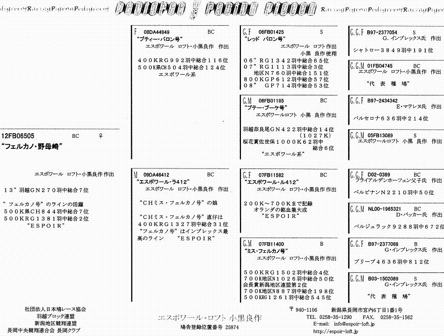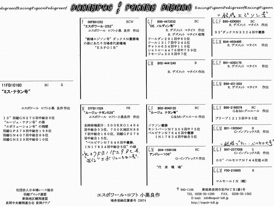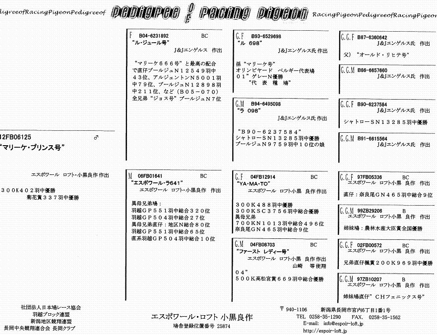 上写真、下記の血統書は、優勝鳩 ”マリーケ・プリンス号”